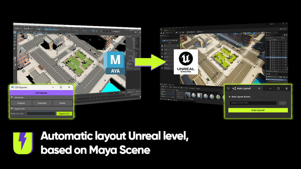 Unreal Engine Plugin and a MEL script to auto layout actors in UE level, based on Maya scene.